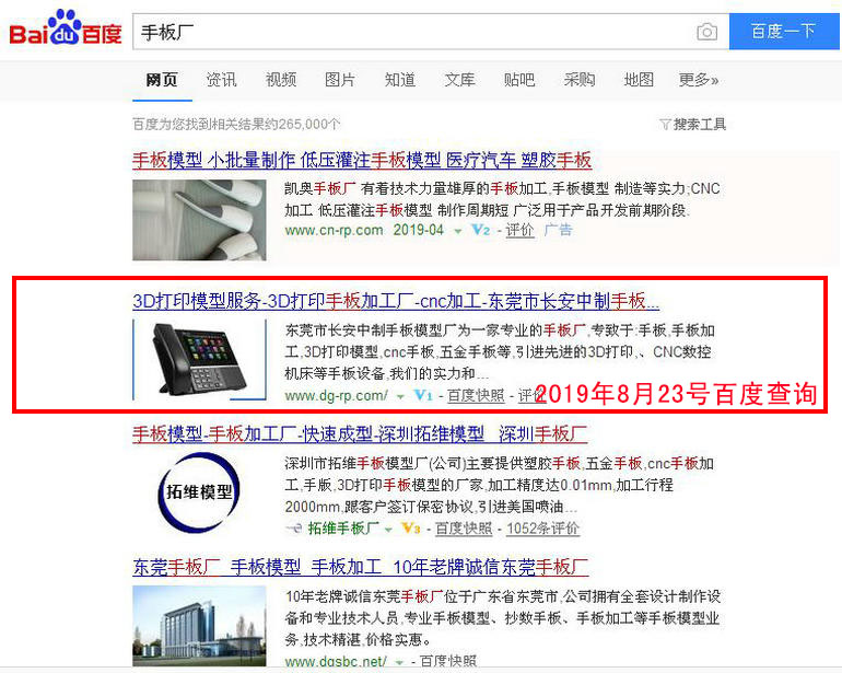 東莞手板廠 : 2019-02-28上線    2019-03-05百度第18名    2019-03-19百度第8名    2019-03-25百度第2名(排名第1名的網站www.dgsbc.net也是我公司管理優化的網站)